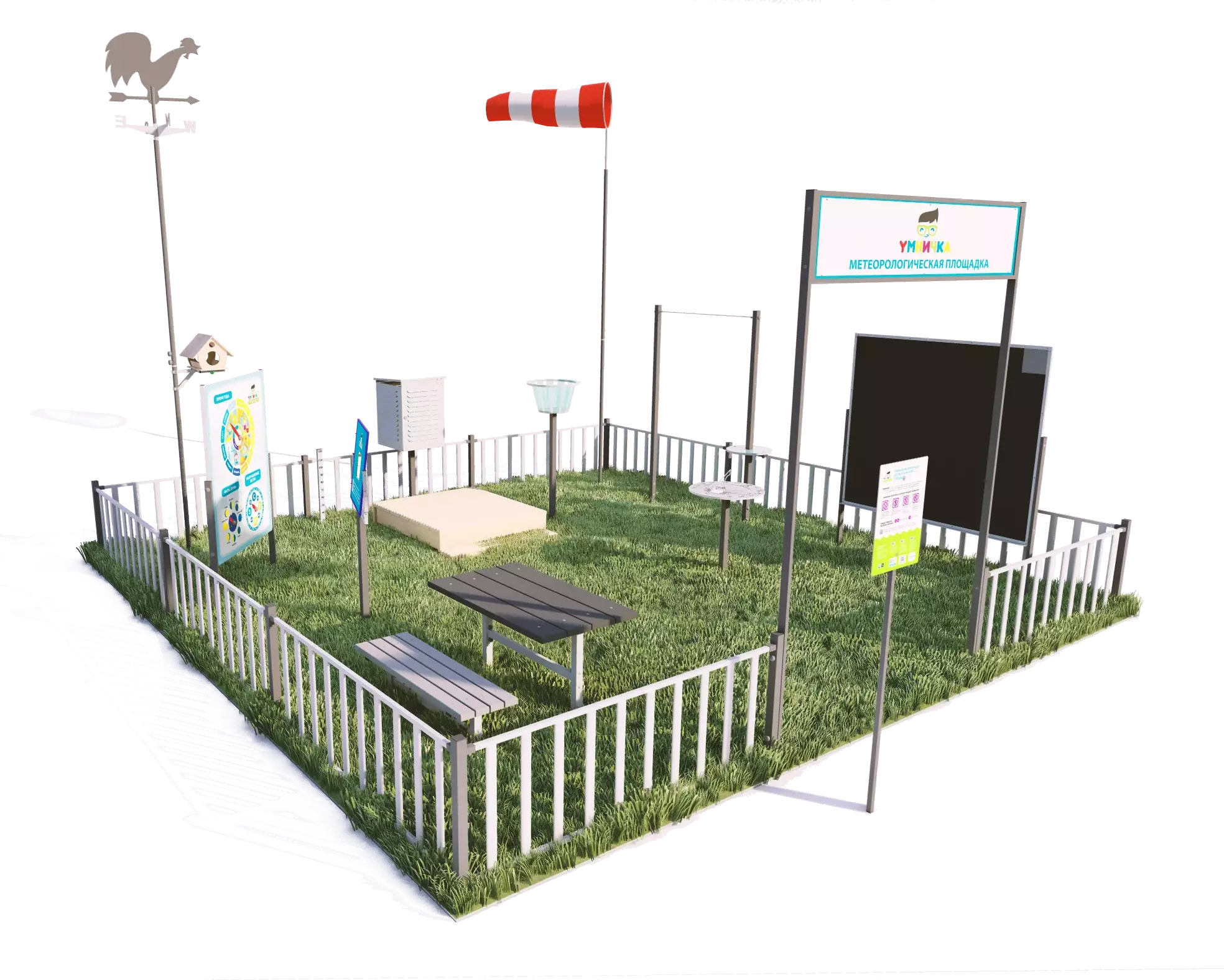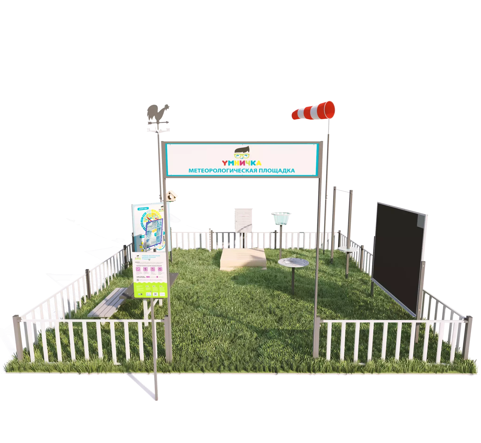 Комплектация: Солнечные часы, Метеобудка, Барометр, Флюгер, Ветровой рукав, Кормушка для птиц, Линейка для измерения снежного покрова, Программа метеослужбы на учебный год, Ограждение забором 19 метров, Стенд магнитно-меловой, Журнал наблюдений за погодой, Лавочка, Мерзлометр, визуализатор погоды, термогигрометр, Программа платной услуги и расчеты с прогнозом окупаемости, Входная группа, видеообучение