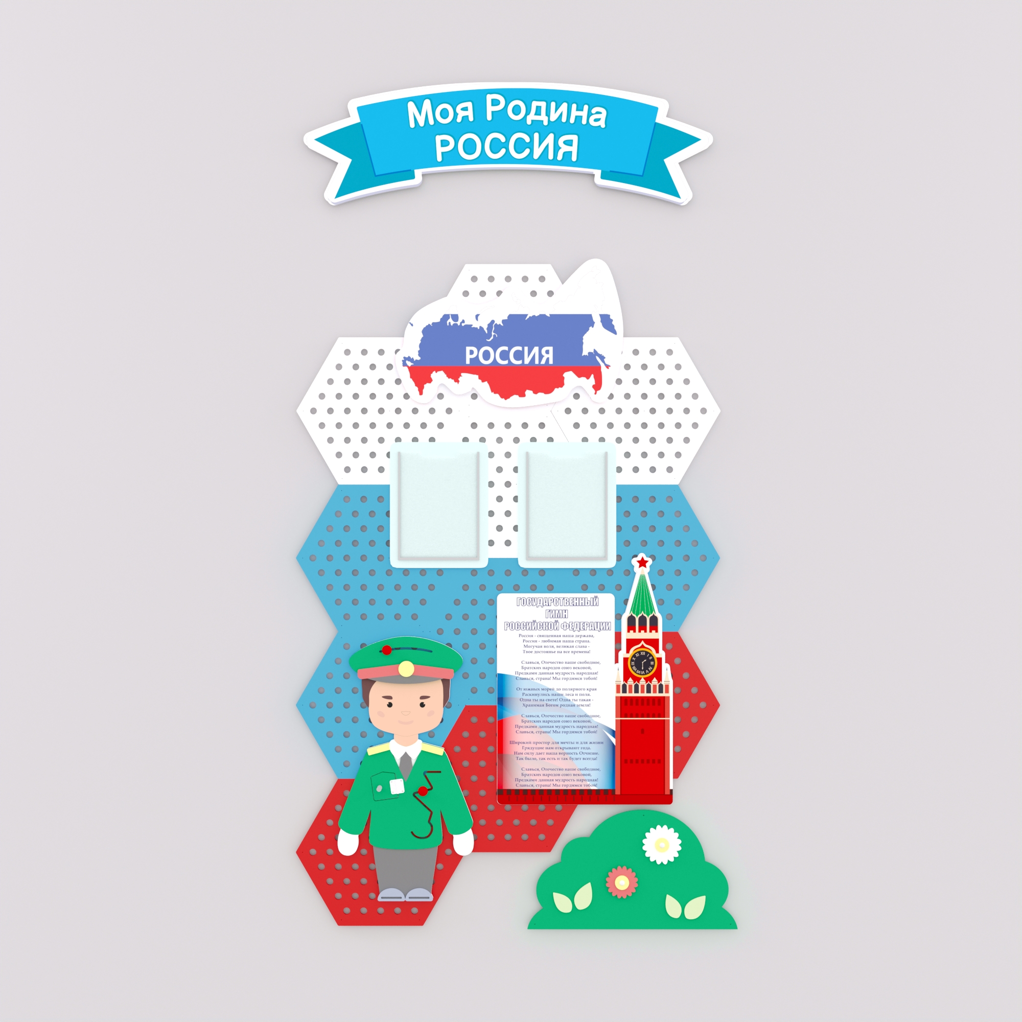 Информационный стенд «Мой край» с изображением официальных символов России. Используйте стенд для проведения занятий по патриотическому воспитанию и размещения полезной информации о родном регионе.
