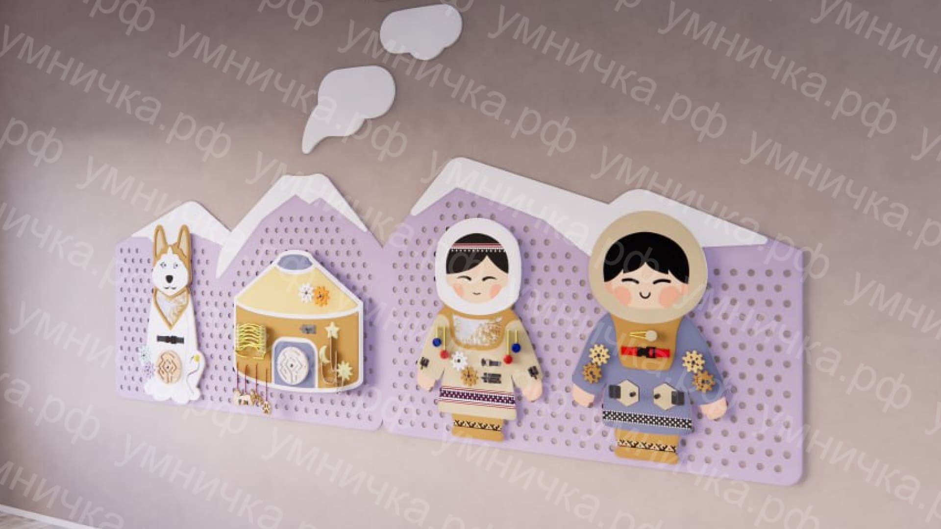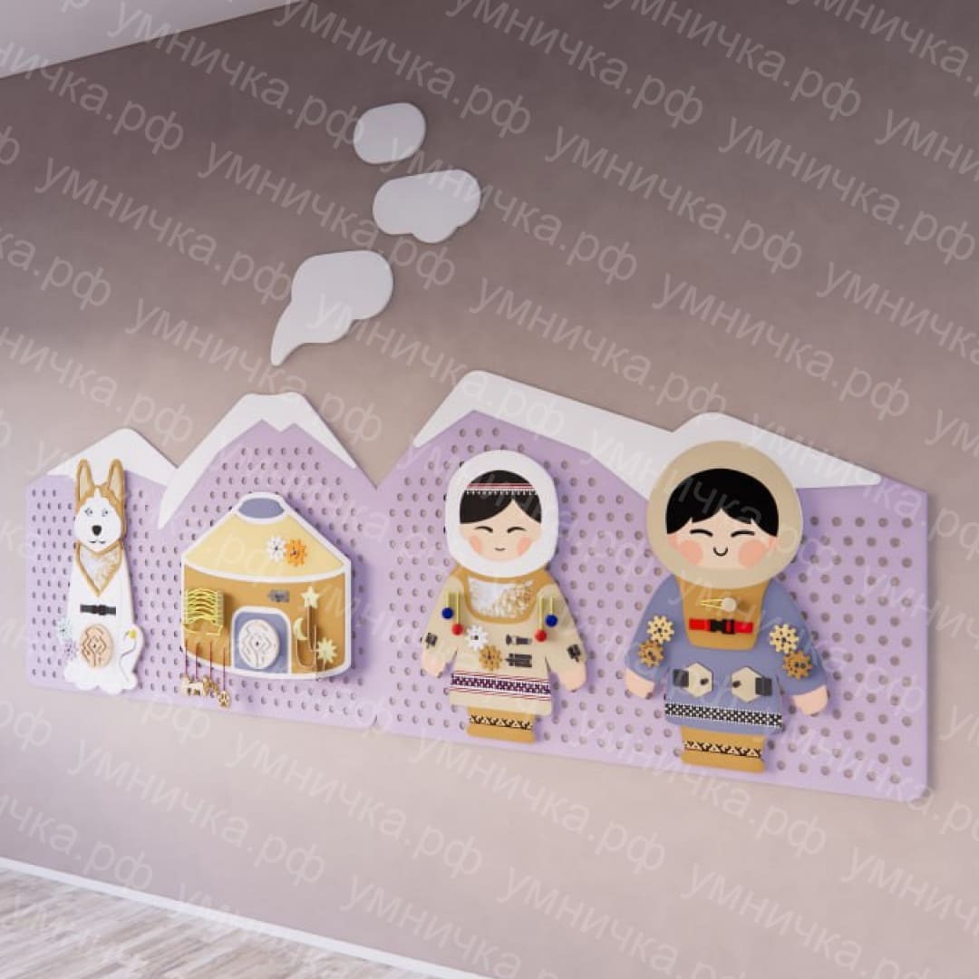 Набор настенных бизибордов «Легенды Камчатки» – функциональное оборудование, благодаря которому дети познакомятся с особенностями народных костюмов, элементами быта жителей Камчатки. Кроме того, бизиборды воспитывают патриотические чувства, любовь к родному краю, учат ценить красоту природы.