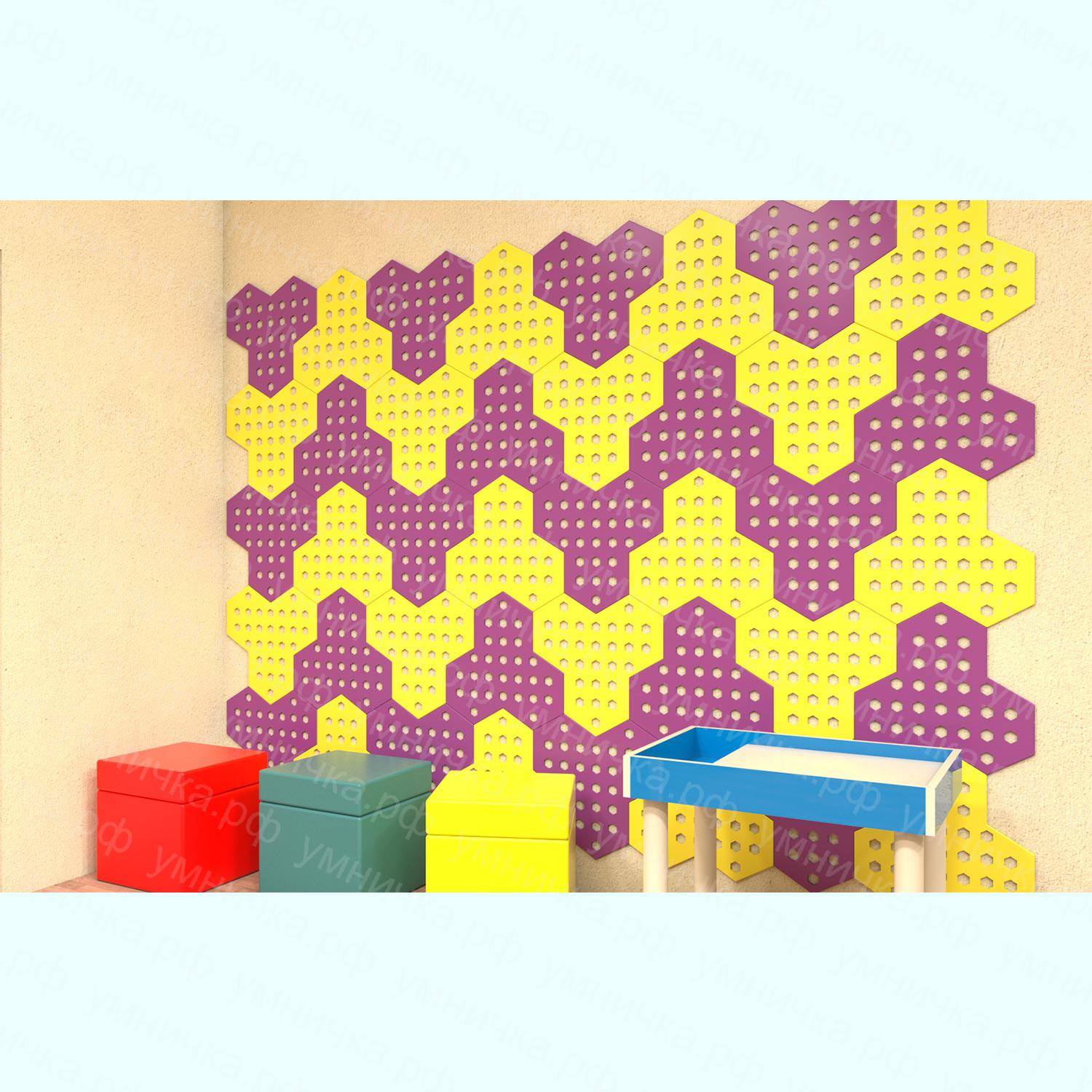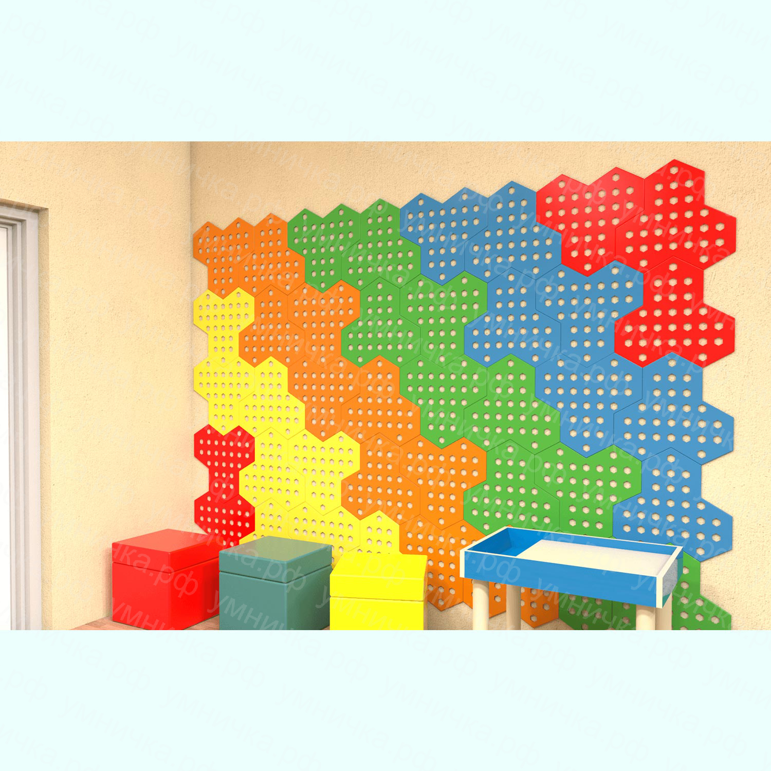«Крекер» – это панели для оформления стен в детских садах, специализированных дошкольных учреждениях, центрах раннего развития, сенсорных комнатах и кабинетах психологов. На этих красочных и многофункциональных панелях вы можете размещать бизиборды, устанавливать полочки, игровой инвентарь и оборудование, выставлять рисунки воспитанников, не повреждая отделку стен.