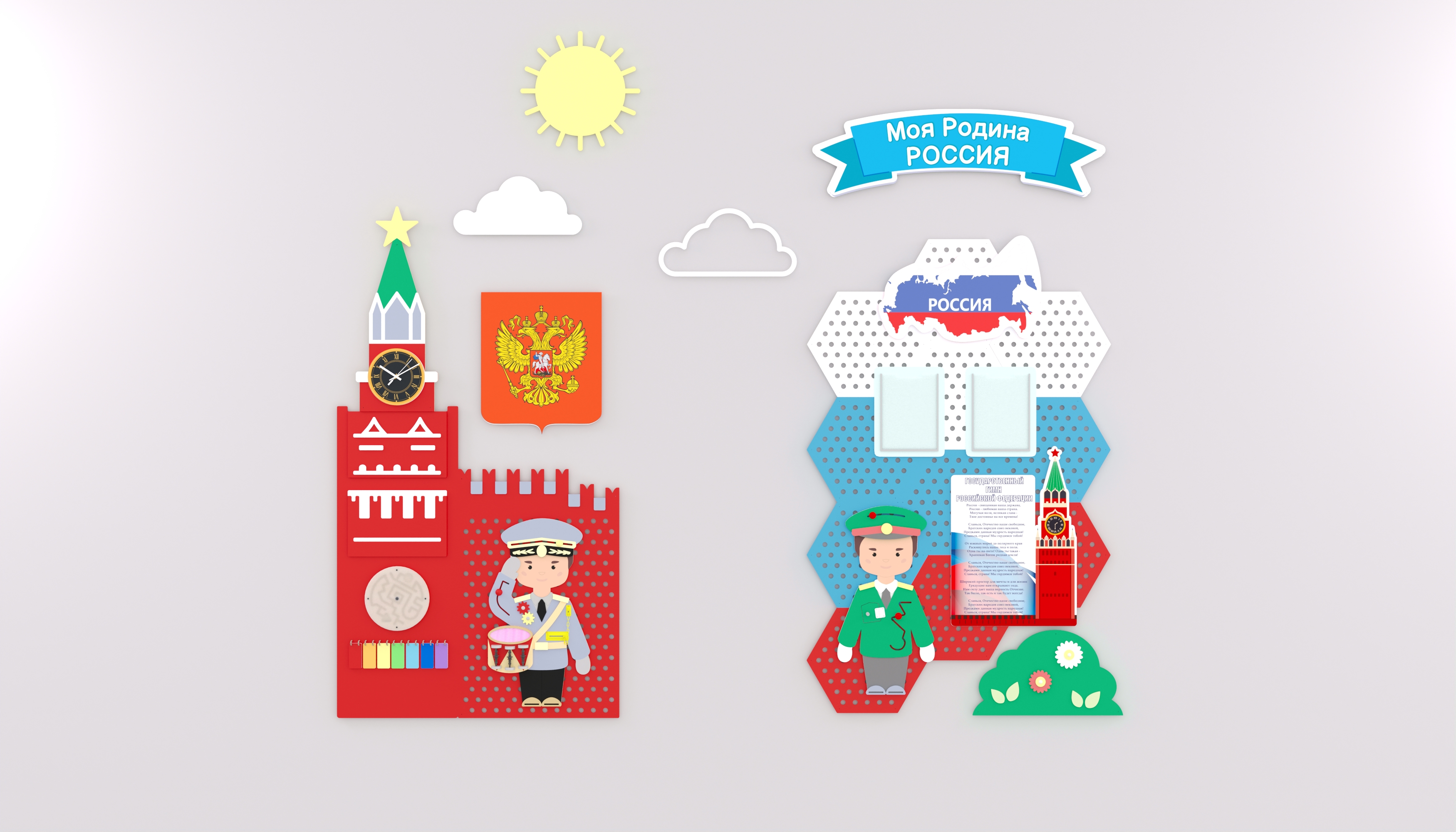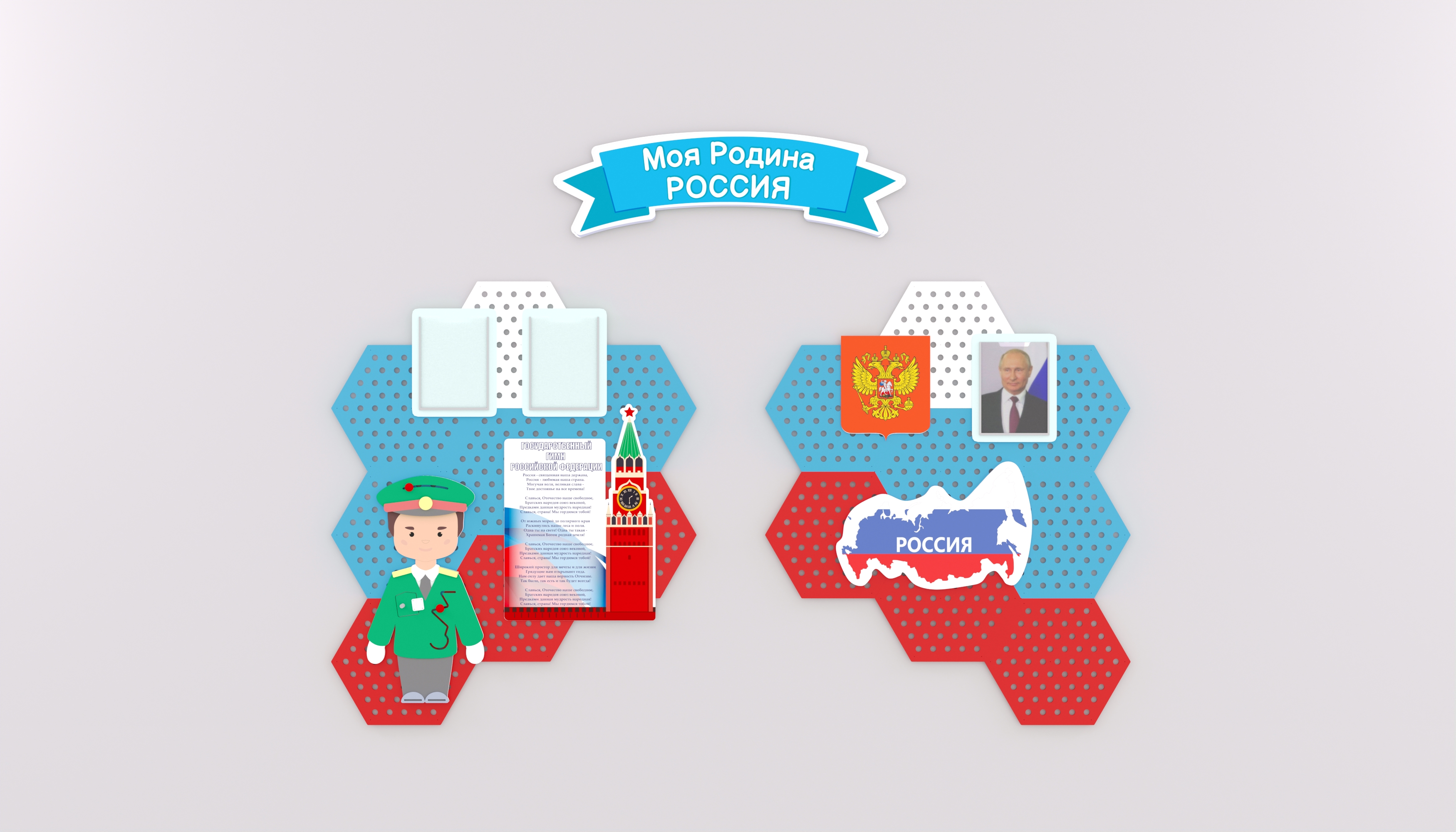 Патриотический уголок «Россия» выполнен в пастельных тонах. На панелях можно расположить элементы в виде государственных символов: герба, гимна и Кремля. Уголок подходит для размещения в группе, классе, холле, коридоре или актовом зале.